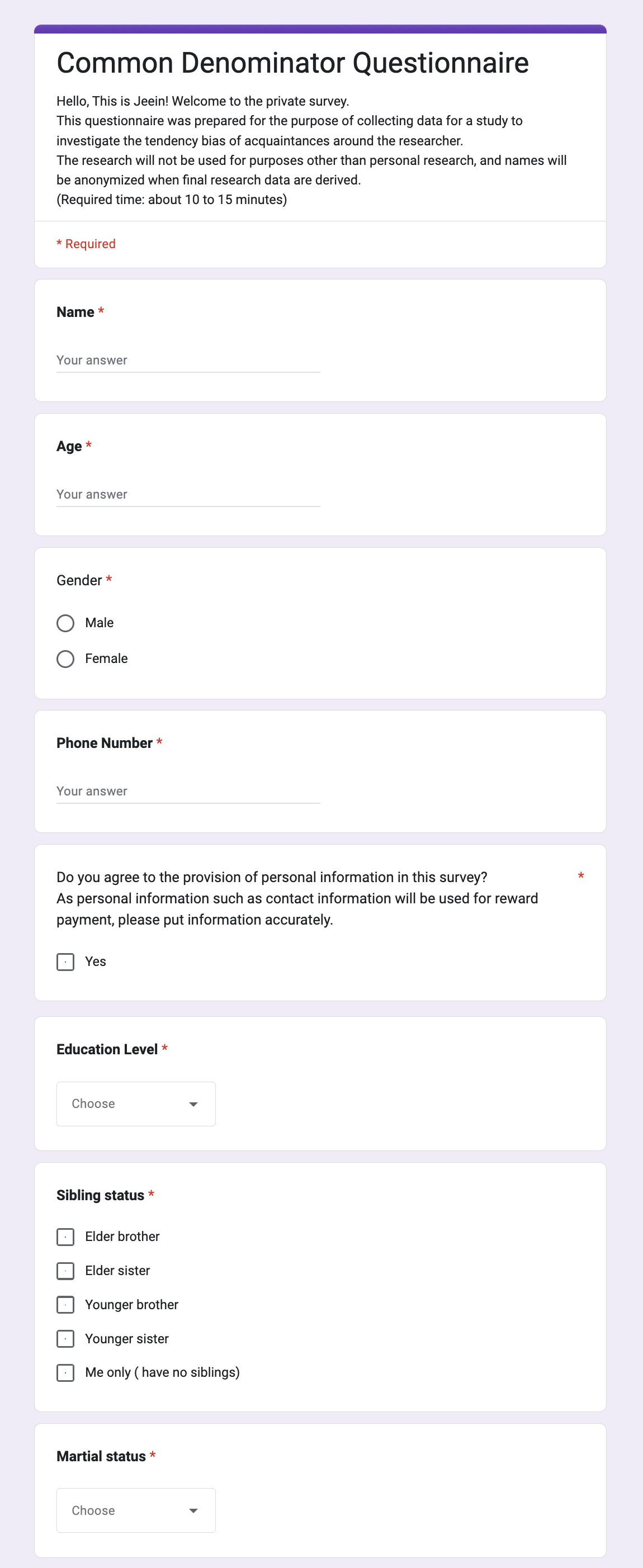 I created a questionnaire and invited various people with whom I have some kind of relationship to complete it. The questions were designed to delicately investigate the various factors that might influence my relationship with each person. Those factors fell broadly into the categories of inborn traits, aspects of temperament, inherent tastes, and acquired tastes. Through the questionnaire, I tried to discover my own biases in choosing the people I prefer and to visualize it as data that could be understood at a glance.